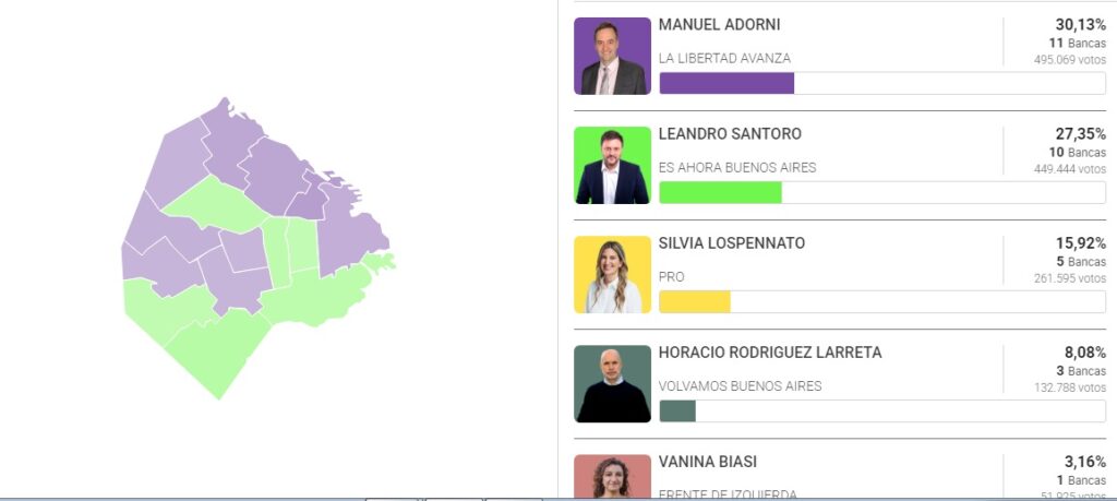 En comicios con el porcentaje de participación más bajo de los últimos 28 años, (53,32 %) La Libertad Avanza con su candidato el vocero presidencial Manuel Adorni, obtuvo el 30,14 %, venciendo a sus inmediatos competidores, Leandro Santoro del espacio “Es Ahora Buenos Aires”, (27,35 % ) y Silvia Lospennato, del PRO, fuerza que hizo la peor elección de su historia en lo que hasta hoy era su bastión. (15,92 %) El ex jefe de Gobierno porteño, Horacio Rodríguez Larreta, terminó cuarto con el 8,08% de los votos y aseguró su ingreso y el de Guadalupe Tagliaferri a la Legislatura. Emmanuel Ferrario, tercero en la lista, mantendrá la banca que ocupa actualmente. Vanina Biasi, del Frente de Izquierda, con el 3,16%, también ingresará al recinto legislativo.