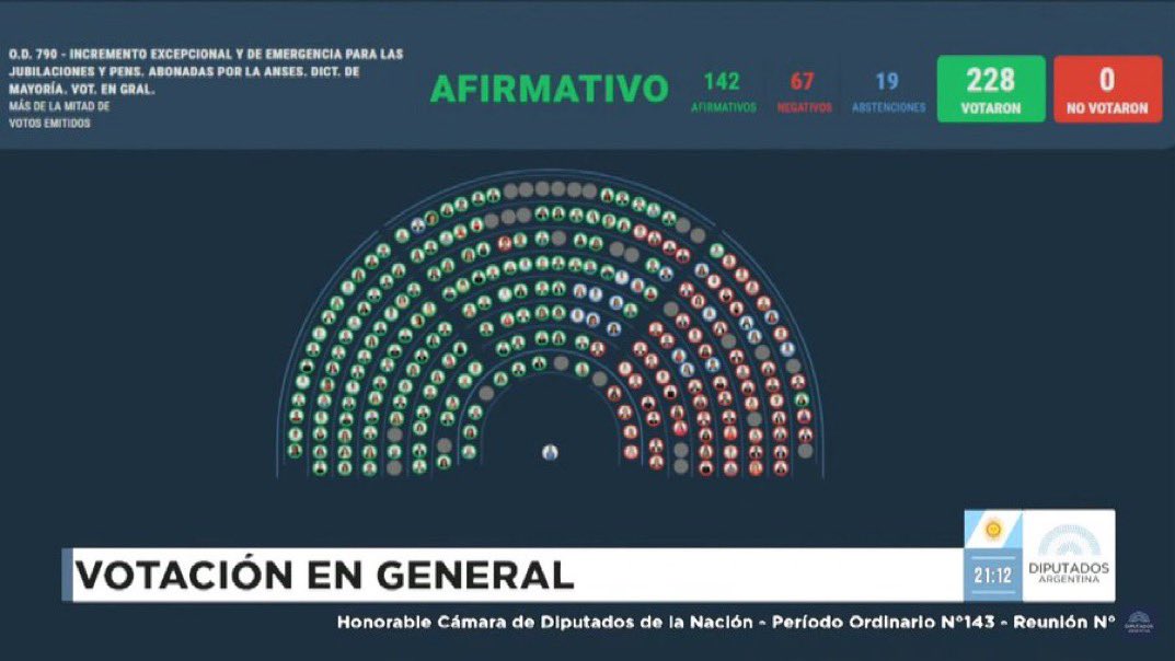 El aumento de los haberes y el bono fue aprobado con 142 votos afirmativos, 67 en contra y 19 abstenciones. Esto se logró al alcanzar una mayoría conformada por Unión por la Patria, el Frente de Izquierda, la Coalición Cívica, Encuentro Federal, Democracia para Siempre e Independencia. En contra votaron LLA, el PRO y bloques provinciales. La UCR se abstuvo.